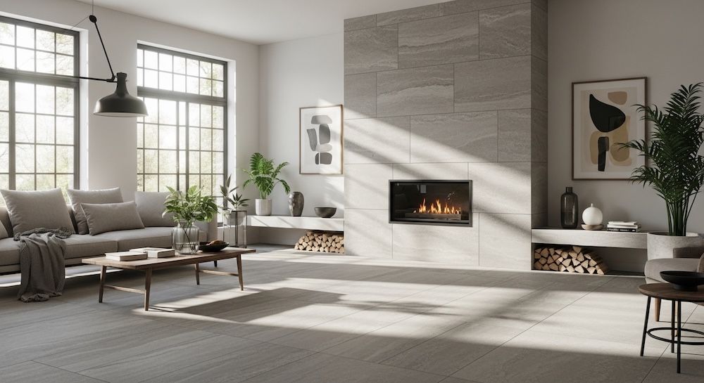 Ilgą laiką plytelės buvo siejamos tik su „šlapiomis“ patalpomis. Tačiau didelio formato akmens imitacijos plytelės pakeitė šį suvokimą. 120×120 cm ar net didesni formatai leidžia sukurti beveik vientisą grindų paviršių.